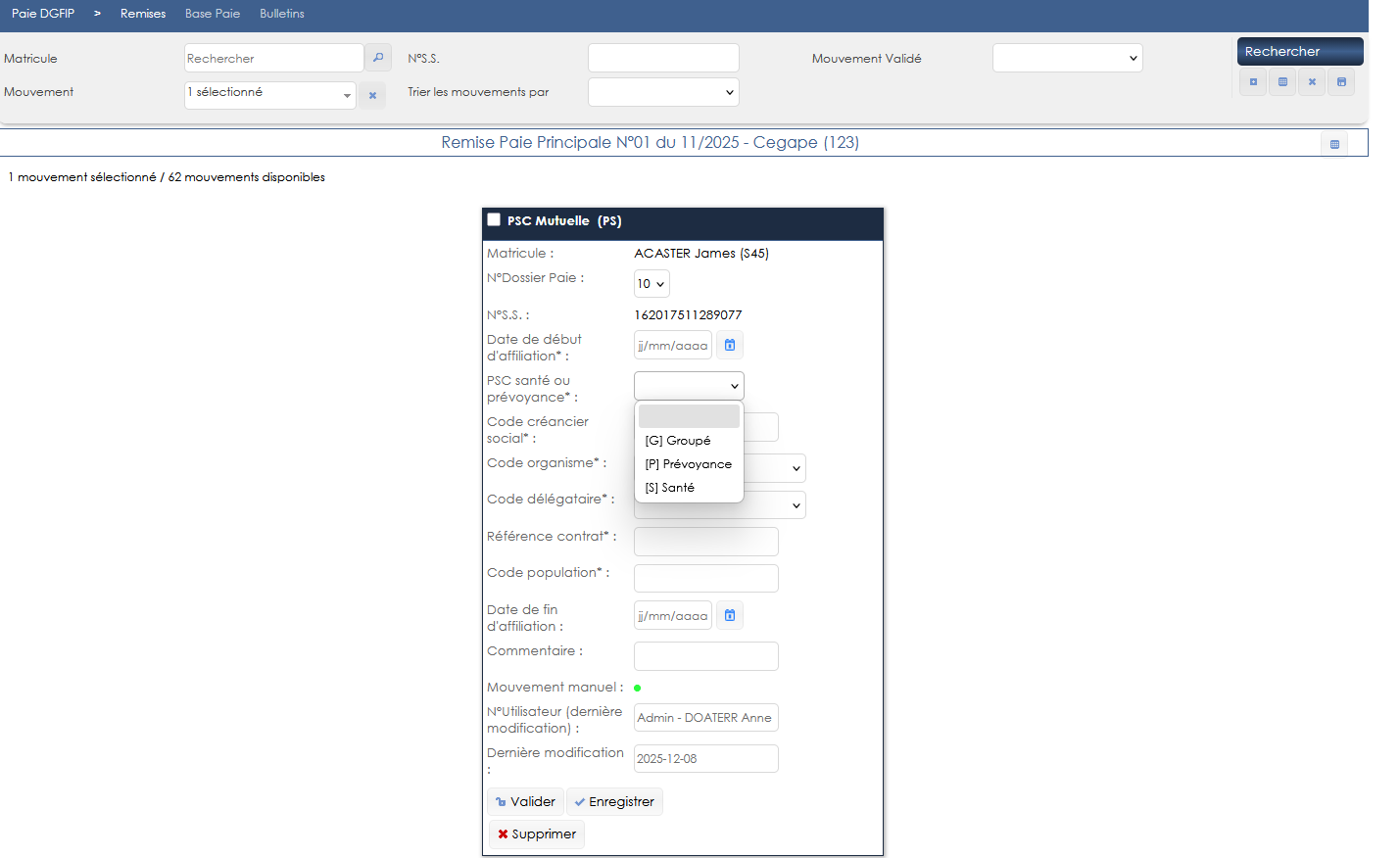 La génération individuelle des movement se fait depuis le livret individuel de l’agent, dans l’onglet “Paie DGFiP”.