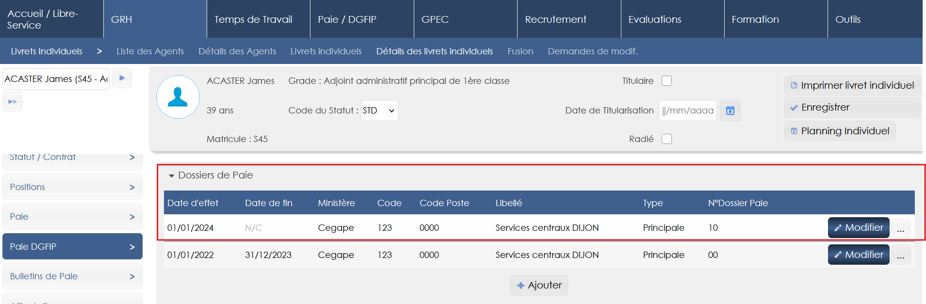 GRH > Livrets individuels > détails des livrets > Paie DGFiP