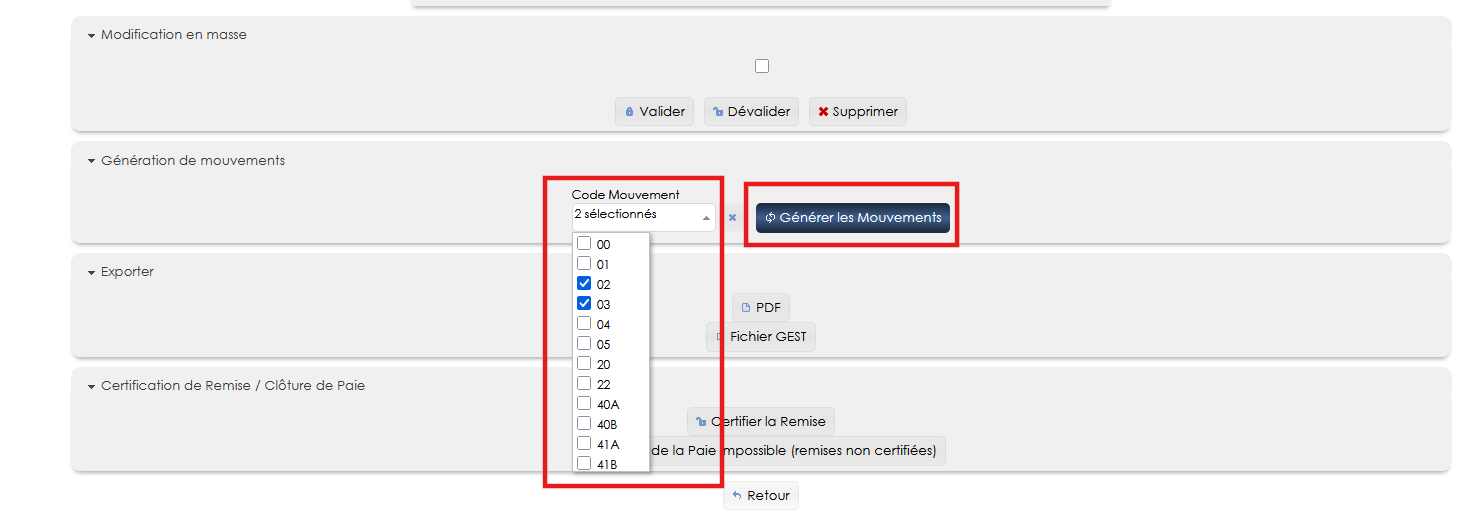 Aller dans le bloc “Génération des mouvements en bas de l’écran et cliquer sur “Générer les mouvements”. Il est possible de générer seulement les mouvement d’un ou plusieurs codes mouvement.