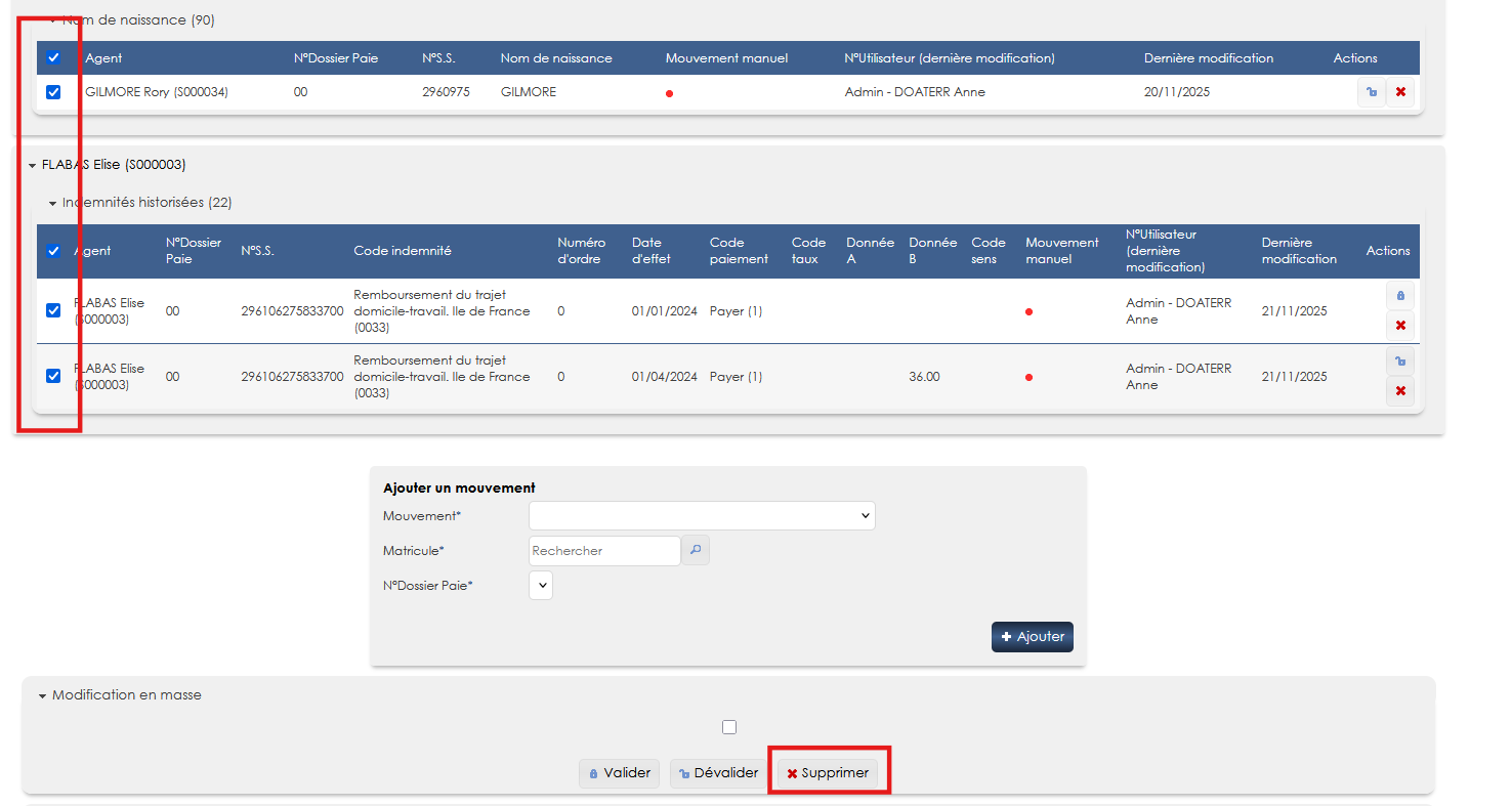 Cocher la case dans le bloc “Modification en masse” ou ne rien cocher puis cliquer sur “Valider” ou “Dévalider” dans “Modification en masse” Valide ou dévalide tous les mouvements affichés à l’écran.