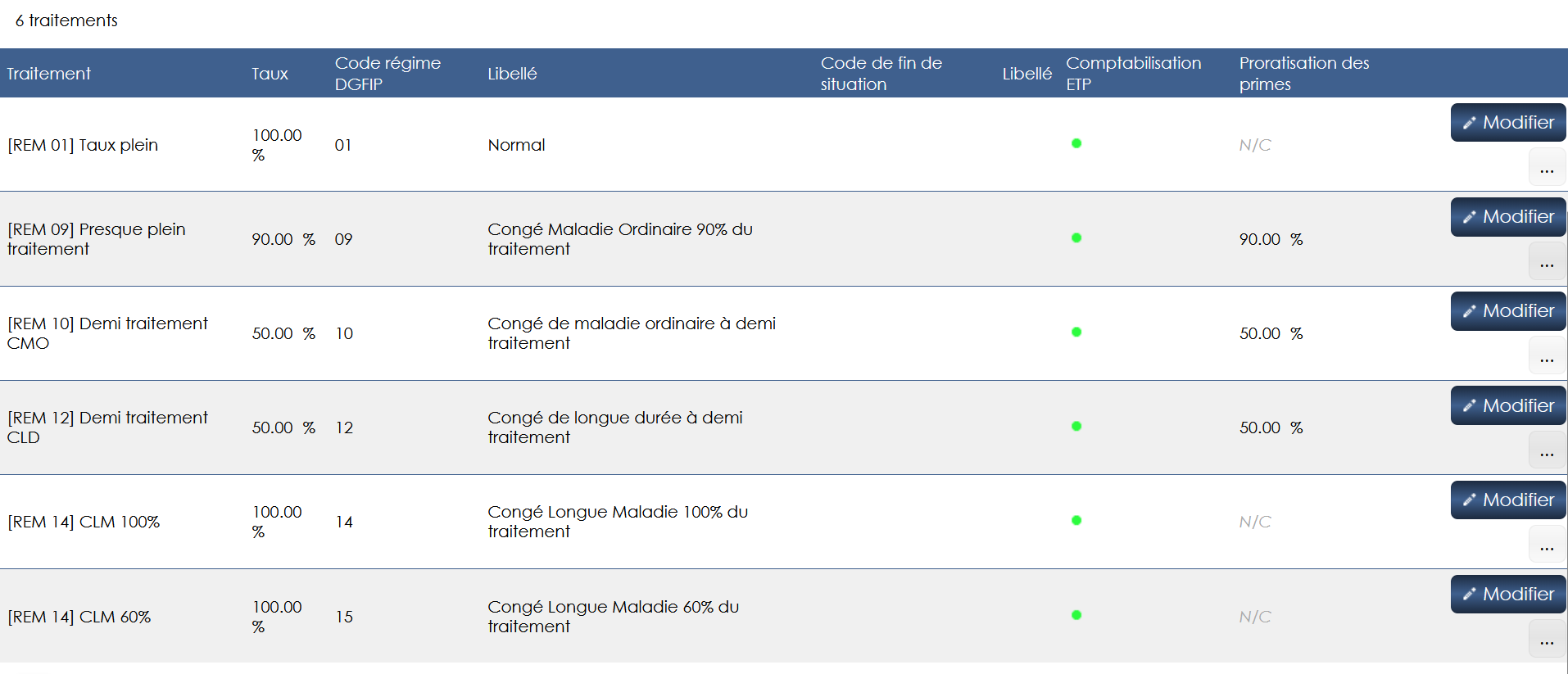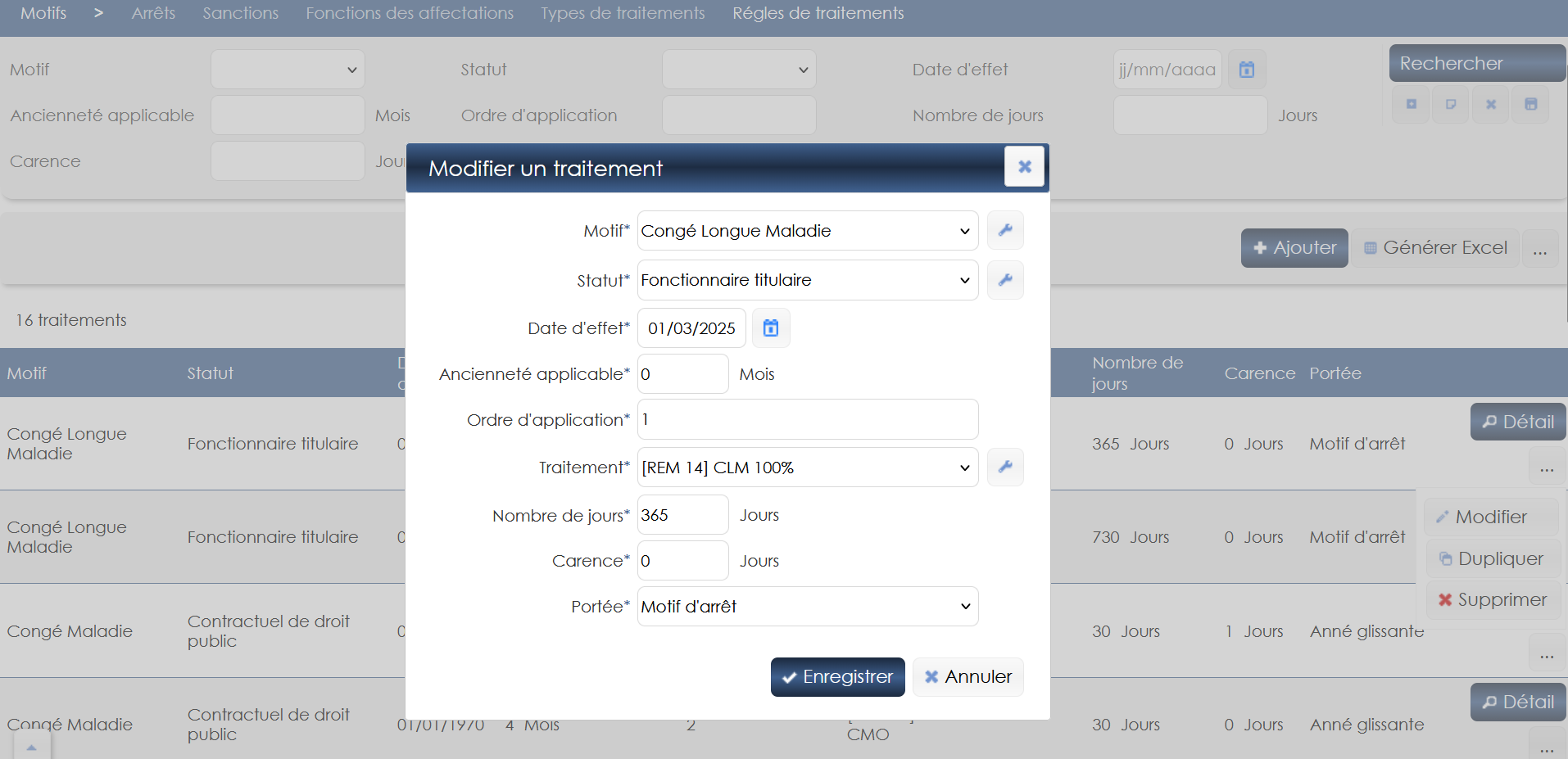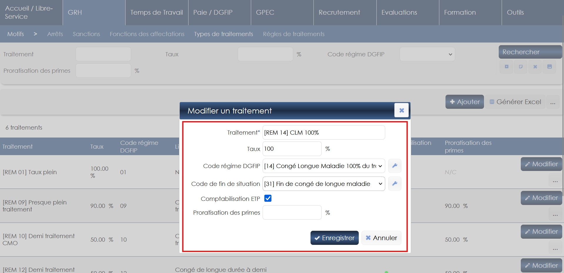 Les types de traitement permet de créer le traitement par lequel l’agent sera concerné pendant son absence maladie.