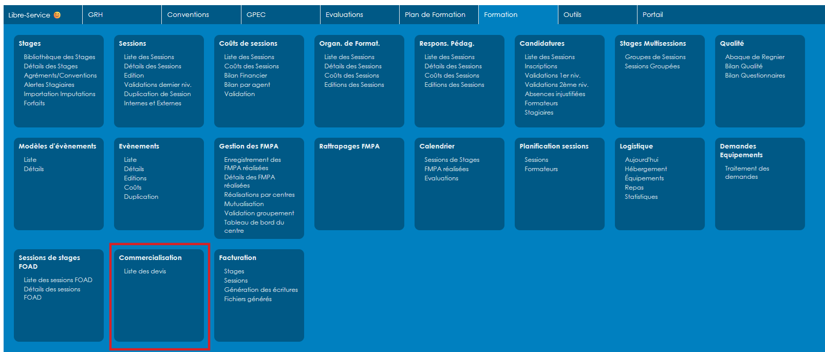 Le sous-module commercialisation est dépendant du module Formation. Il permet la création et l’émission de devis, voire de factures, avec un publipostage spécifique, paramétrable par le SDIS.