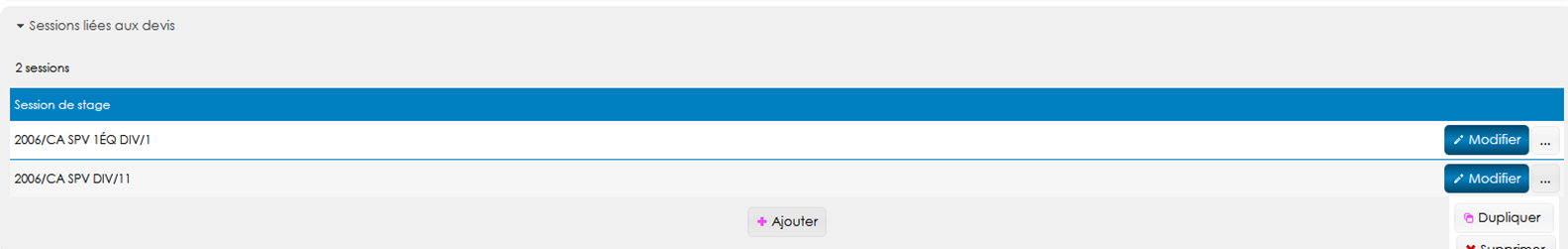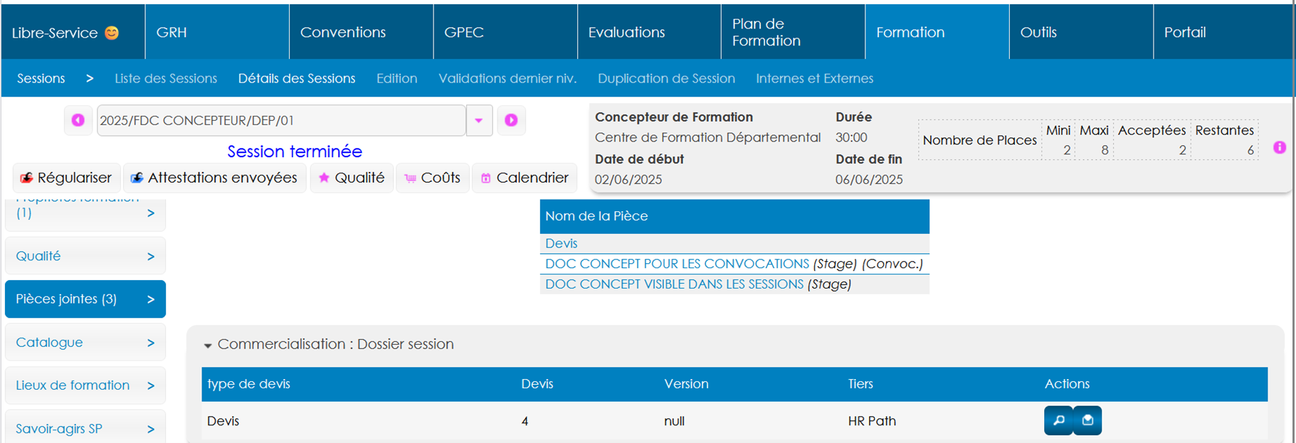 Le devis généré peut être ajouté dans les sessions, dans le bouton pièces jointes, et il est possible de paramétrer des notifications pour l’envoi de ces devis.