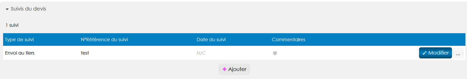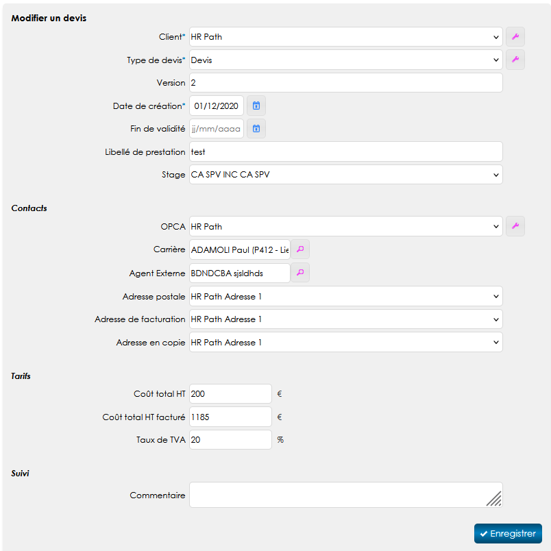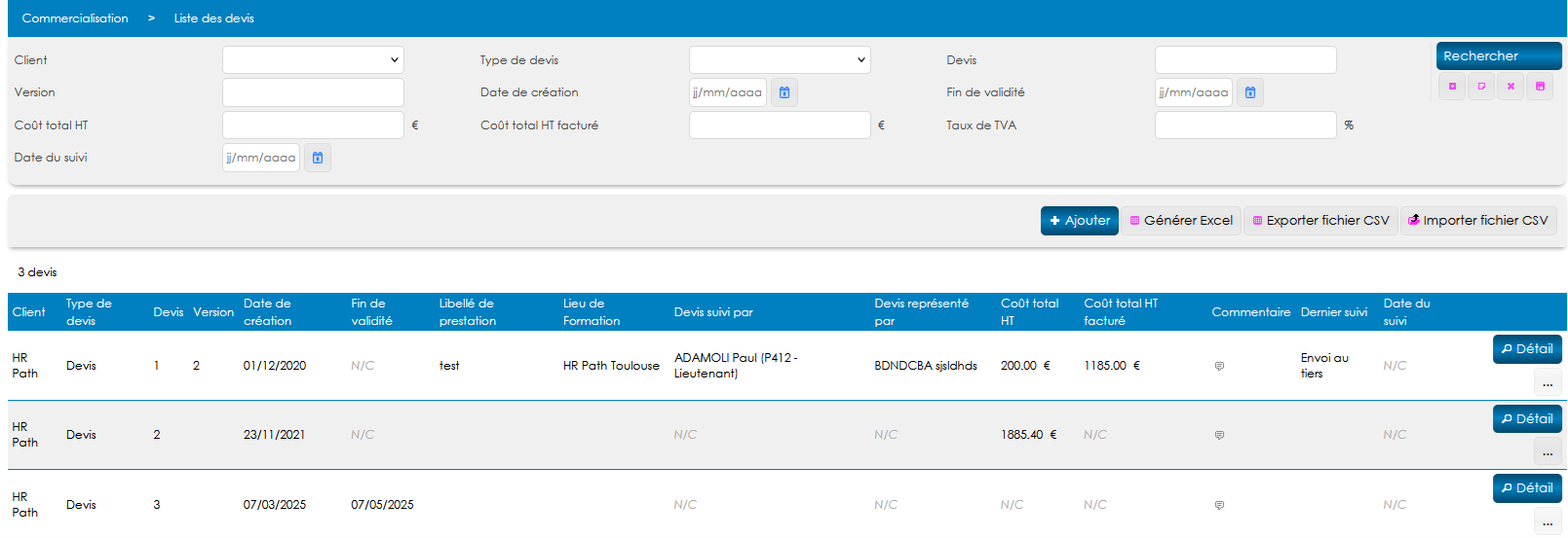 La création et les différentes modifications se font via le menu : Formation -> Commercialisation -> Liste des devis Toutes les informations peuvent-être modifiées, et les types de suivis permettent un suivi de la vie du devis et une recherche par type dans les filtres de recherche