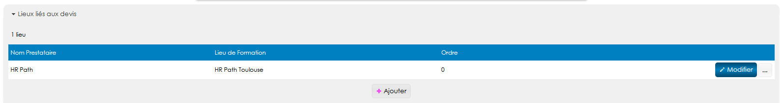 - Des lieux : Avec un ou plusieurs prestataires et un ou plusieurs lieux de formation : à paramétrer dans l’écran : Formation -> Lieux de Formation-> Prestataires et Formation -> Lieux de Formation-> Lieux de Formation (lors de l’ajout d’un lieu dans le devis, la mollette permet d’accéder directement à ces écrans). Ces lieux peuvent être ordonnés